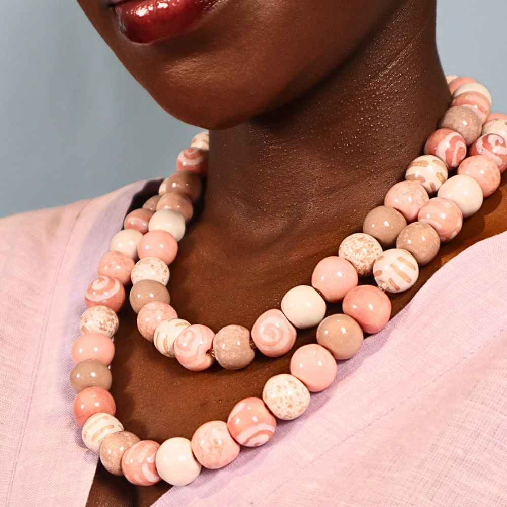Experience the heavenly beauty of the Heavenly Pink necklace. Inspired by the enchanting bougainvillea tree and its various shades of pink, this necklace captures the essence of natural splendor. Crafted with our round beads and enhanced by simple designs, the Heavenly Pink necklace is a delicate accessory that exudes elegance and grace. It is a perfect choice for those seeking a touch of floral charm in their style. Available in 18. 22 and 30 "