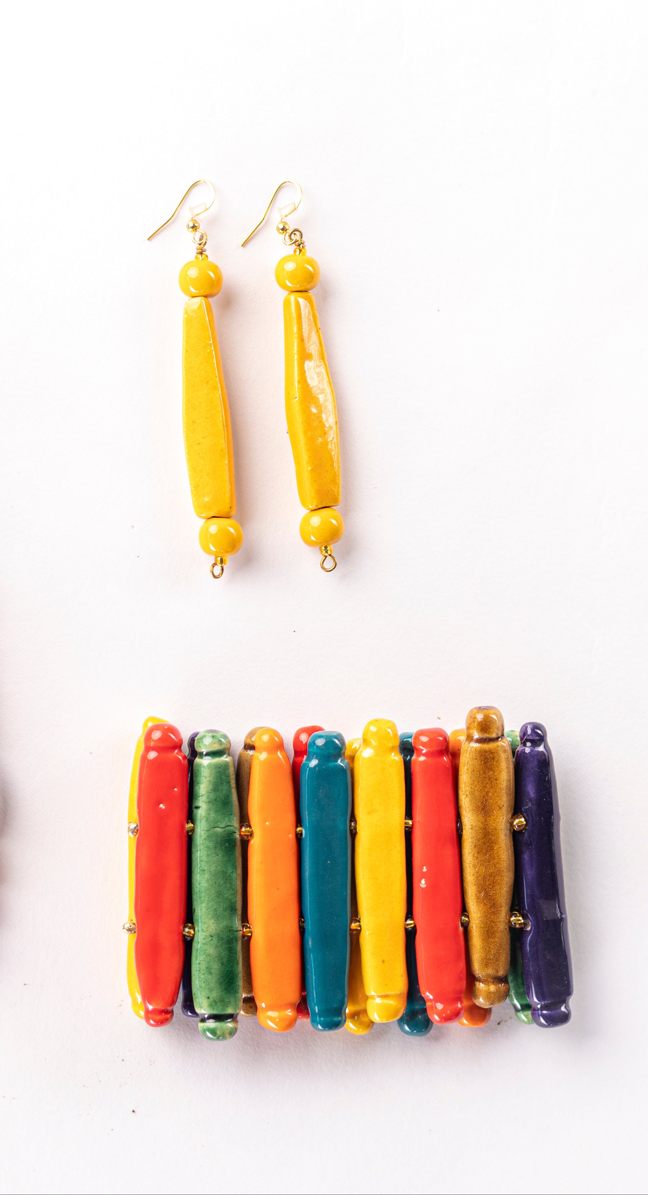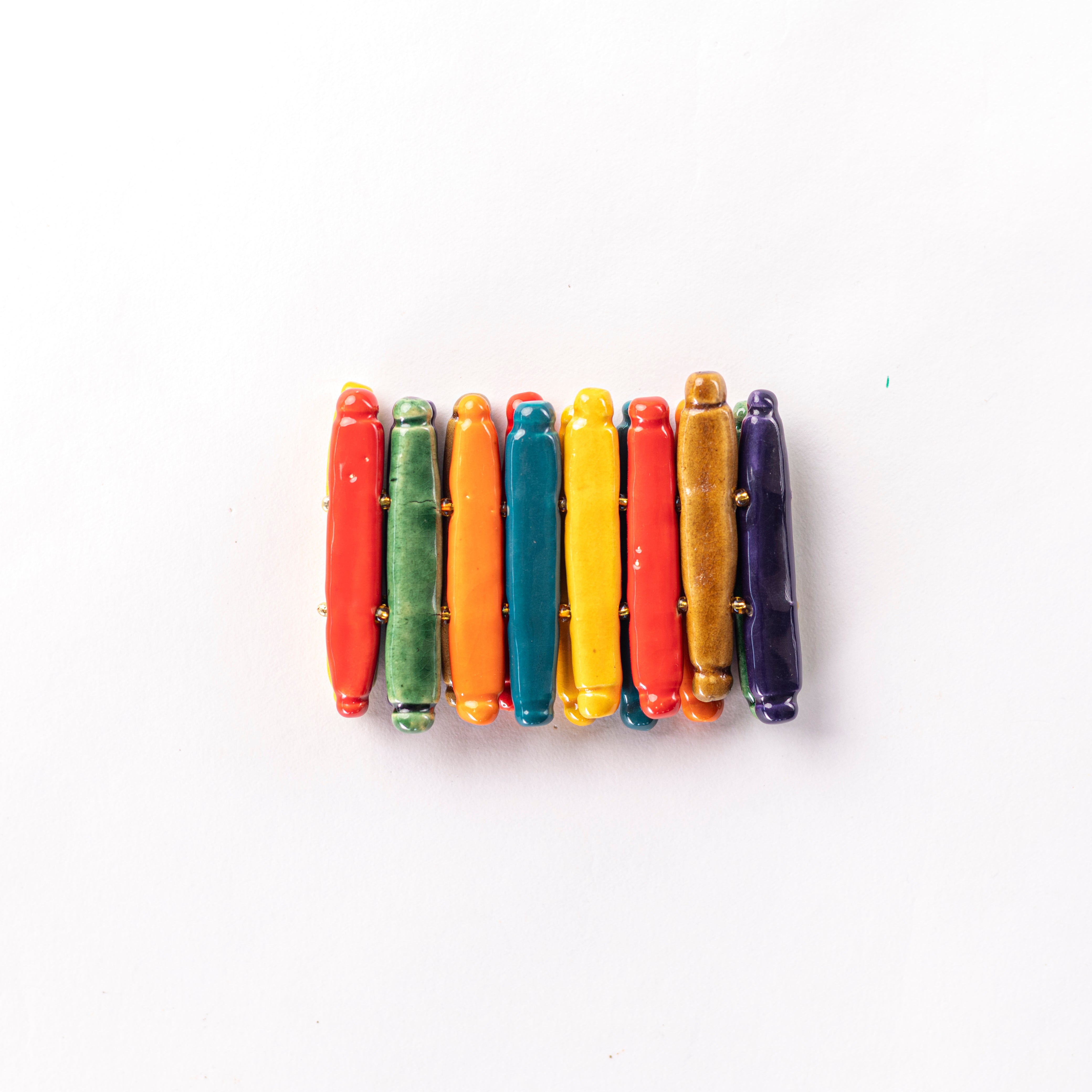 Key materials: Assorted handcrafted Kazuri clay beads, 18k gold-plated spacer beads and elastic band.